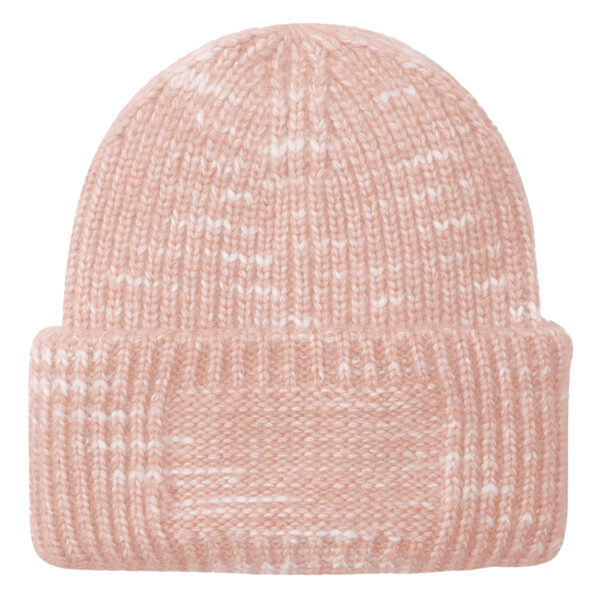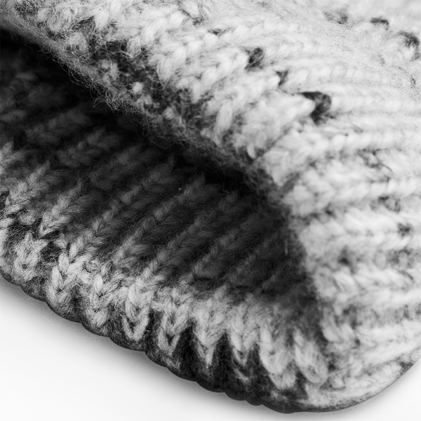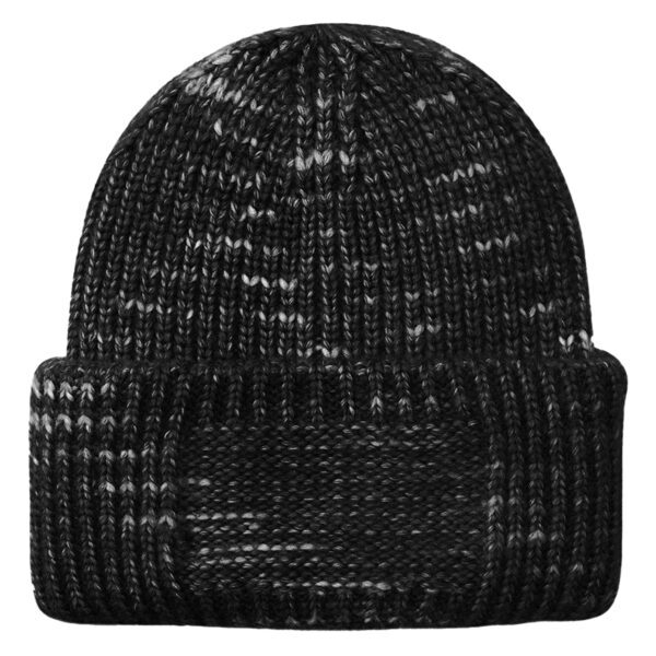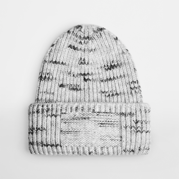 50% recycled polyester/50% acrylic. Heavyweight multi yarn design. Engineered crown. Double layer turn up cuff. Reverse knit cuff for decoration (15 x 5cm). Tear out label.