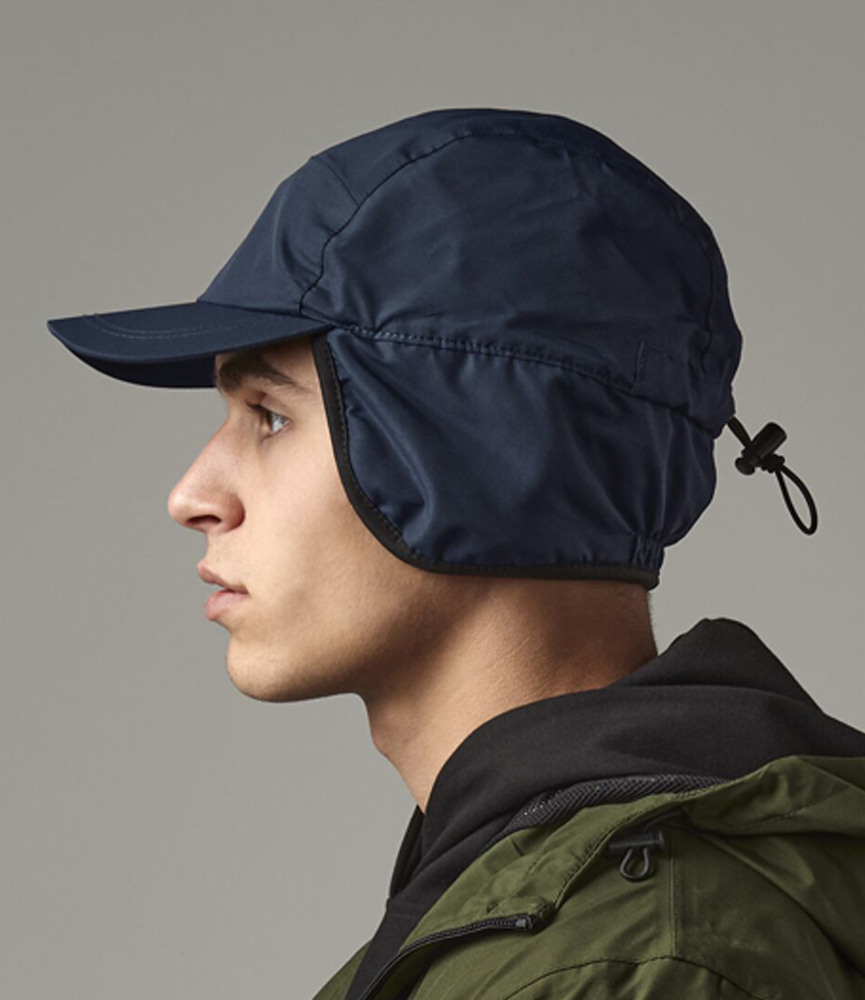 100% nylon taslon outer. 100% polyester Suprafleece® lining.Waterproof and breathable fabric.5 panel.Taped seams.Pre-curved peak.Optional fold down earflaps.Elasticated size adjuster.