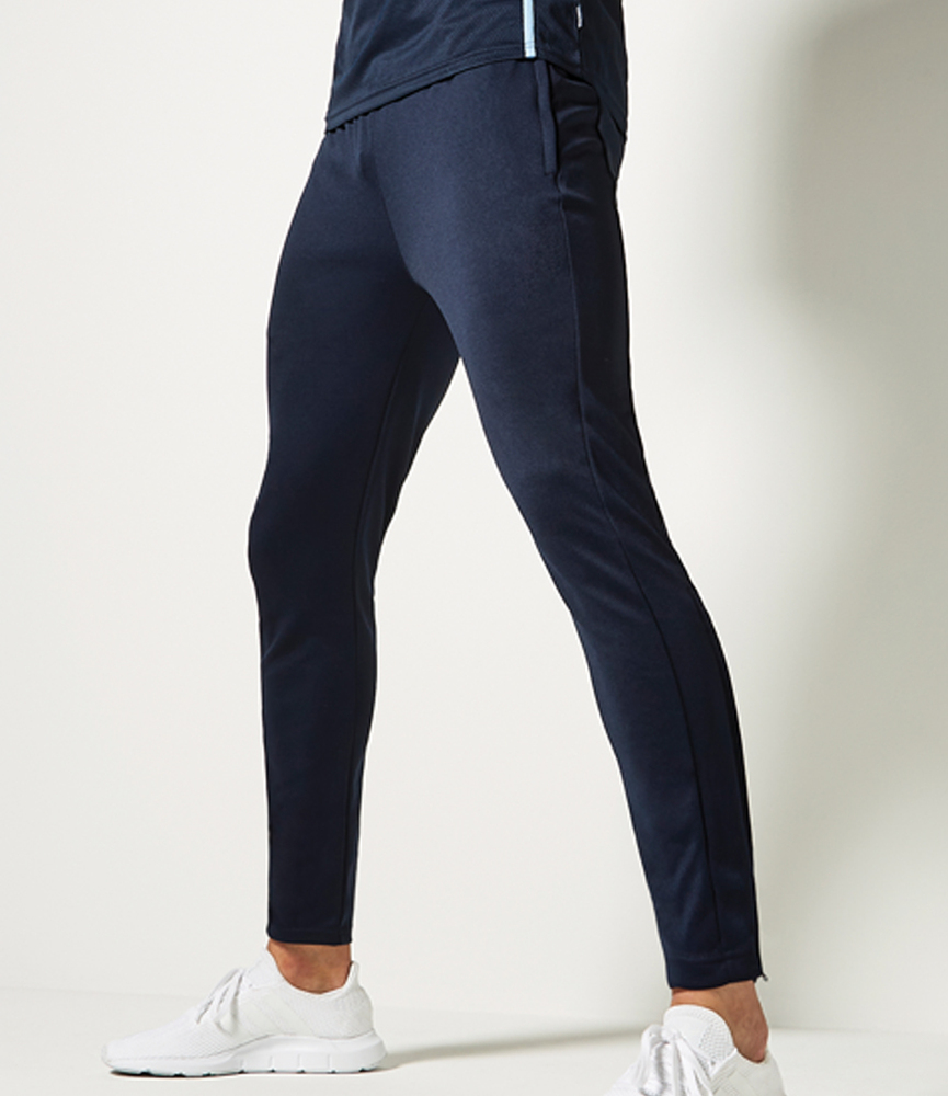 100% polyester interlock. Modern fashion fit with tapered leg. Elasticated waistband with inner drawcord. Self fabric panels on outside leg. Two side zip pockets. Concealed zips to lower legs.