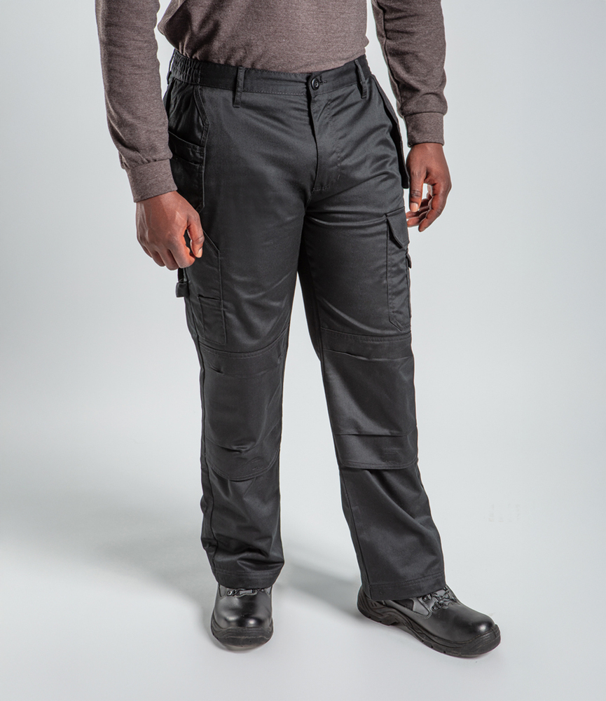 65% polyester/35% cotton. Part elasticated waistband with belt loops. Zip fly with stud over. Two front tradesman pockets. Two side pockets. Rear patch pockets. Two multi-use side leg cargo pockets. Ruler pocket. Media pocket. Hammer loop. External tear release knee pad pockets. Twin needle hem.