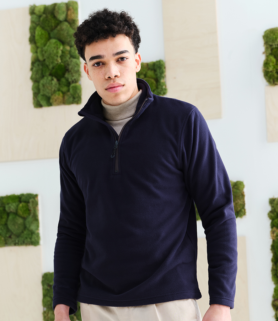100% recycled polyester anti-pill Symmetry® fleece. Easy care and quick drying. Unlined. Taped neck. Zip neck with chin guard and inner zip guard. Open cuffs and hem. Cut out label.
