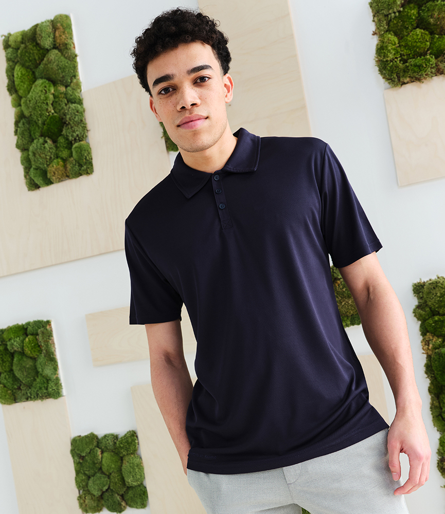 100% recycled polyester. Quick drying, easy care piqué fabric. Anti-bacterial finish. Self fabric collar and cuffs. Three self colour button placket. Twin needle stitching. Cut out label.