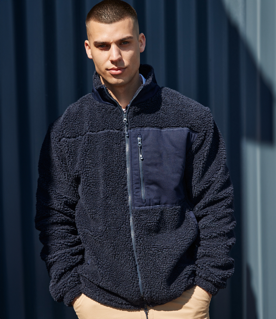 100% recycled polyester sherpa. 65% polyester/35% cotton twill panelling. Fully lined. Contrast funnel collar and back yoke. Full length zip. Left chest zip pocket. Two front pockets with stud closure. Curved hem with drawcord. Flatlock stitched panels. Access for decoration. Tag free.