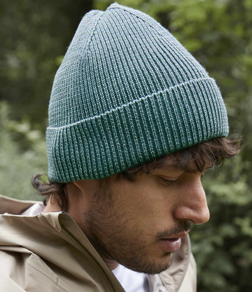 100% recycled polyester. Lightweight and breathable fabric.Double layer knit.Cuffed design.Engineered crown.Highly reflective fibres.Tear out label.