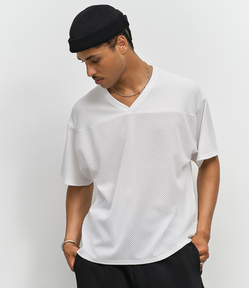 Vintage style.Oversize fit.1x1 ribbed V neck.Interlock, seamless inserts on shoulders.Side seams.Twin needle stitching.Tear out label.