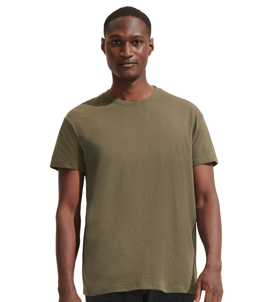 Ribbed collar. Taped neck. Tubular body. Twin needle stitching.